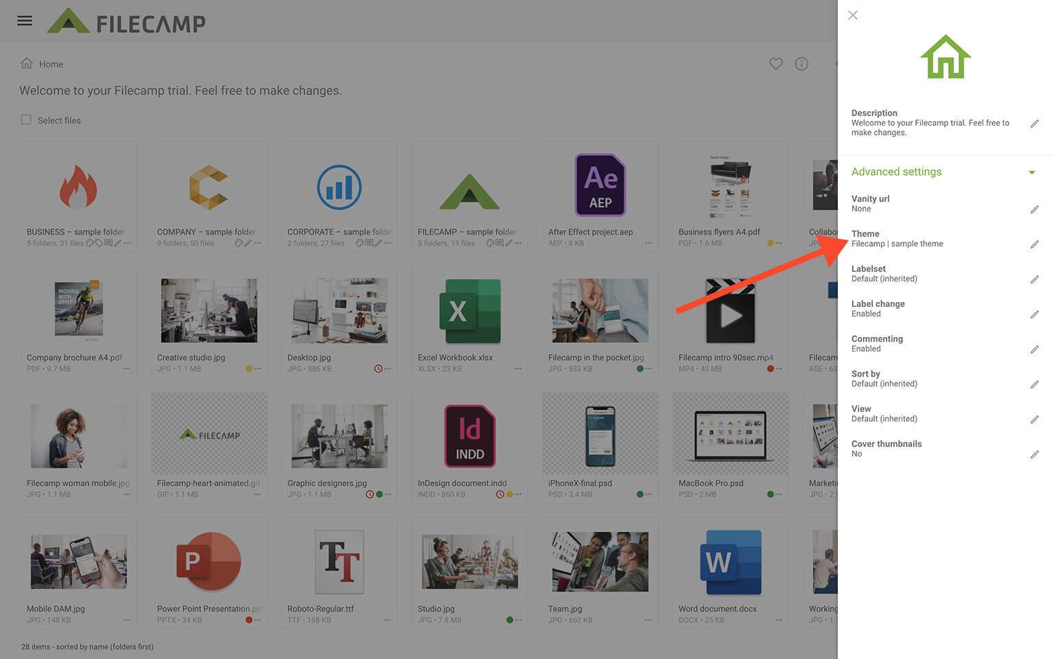 In the edit Theme info window you can quickly customize the look-and-feel of your Filecamp so that you, and your stakeholders, will feel right at home.
