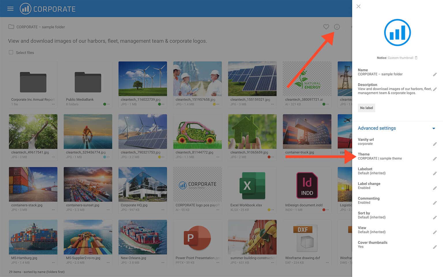 Navigate to the folder you want to change Theme on, then click the Info icon.
